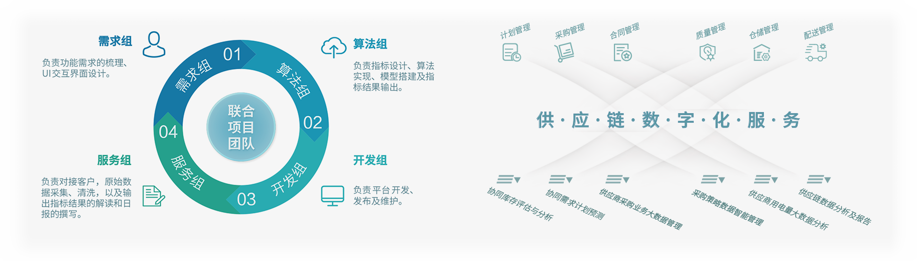 以“業(yè)務(wù)+技術(shù)”的工作模式,派駐數(shù)字化服務(wù)團隊與客戶開展聯(lián)合辦公,通過提供業(yè)務(wù)診斷、工具開發(fā)、數(shù)據(jù)清洗、模型訓(xùn)練等服務(wù),幫助客戶將物聯(lián)網(wǎng)、人工智能、大數(shù)據(jù)分析等前沿技術(shù)嵌入其核心業(yè)務(wù)流程,助力客戶企業(yè)以更快速度、更大規(guī)模推動供應(yīng)鏈發(fā)展與變革。